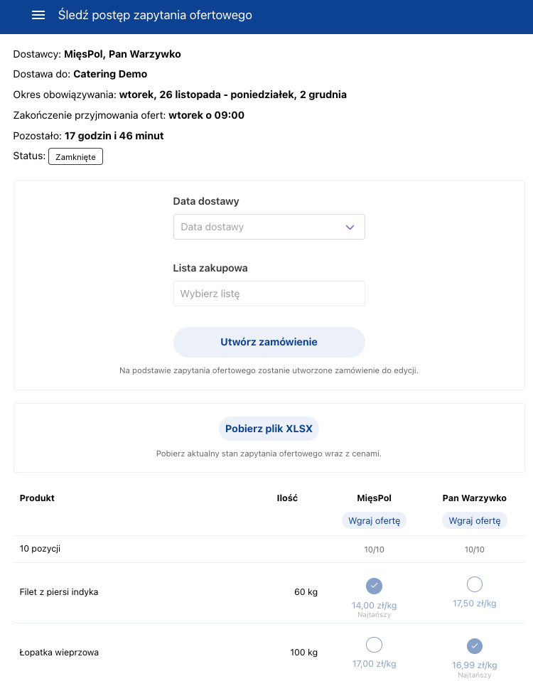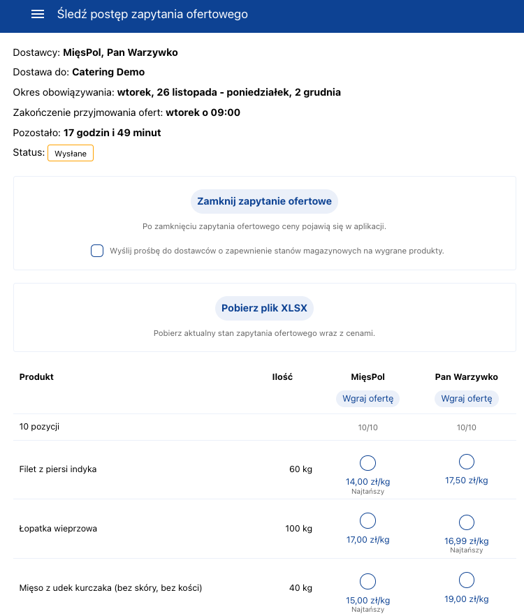 Oferty są zbierane do określonego w zapytaniu terminu, po którym system udostępnia wszystkie otrzymane propozycje. Po zamknięciu zapytania, zostaną automatycznie wybrane najtańsze opcje cenowe. Zanim takie zapytanie zamkniesz, możesz jednak dokonać wyboru ręcznie i wybrać te pozycje, które Cię interesują.