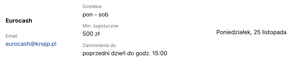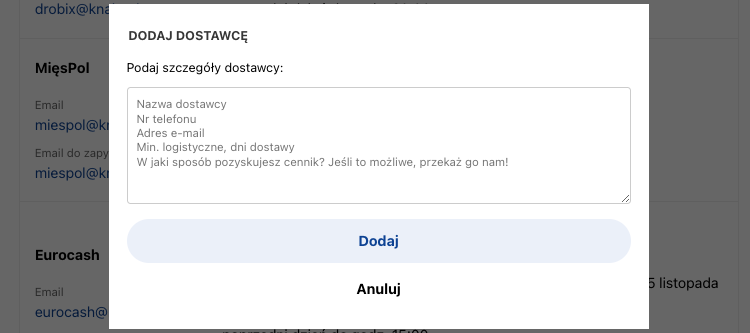Proces dodania nowego dostawcy rozpoczyna się od wprowadzenia podstawowych danych kontaktowych przez użytkownika. Następnie zespół podejmuje bezpośredni kontakt z dostawcą, aby pozyskać kluczowe informacje operacyjne, takie jak szczegółowy harmonogram dostaw, minimalne wymogi logistyczne, terminy składania zamówień oraz inne istotne szczegóły. Na etapie wstępnym wymagane są podstawowe dane identyfikacyjne, obejmujące nazwę firmy oraz dane kontaktowe w postaci numeru telefonu lub adresu email. Jeżeli na tym etapie znasz ustalenia odnośnie logistyki dostawcy do Twojej lokalizacji lub aktualny cennik, również możesz podać takie informację.